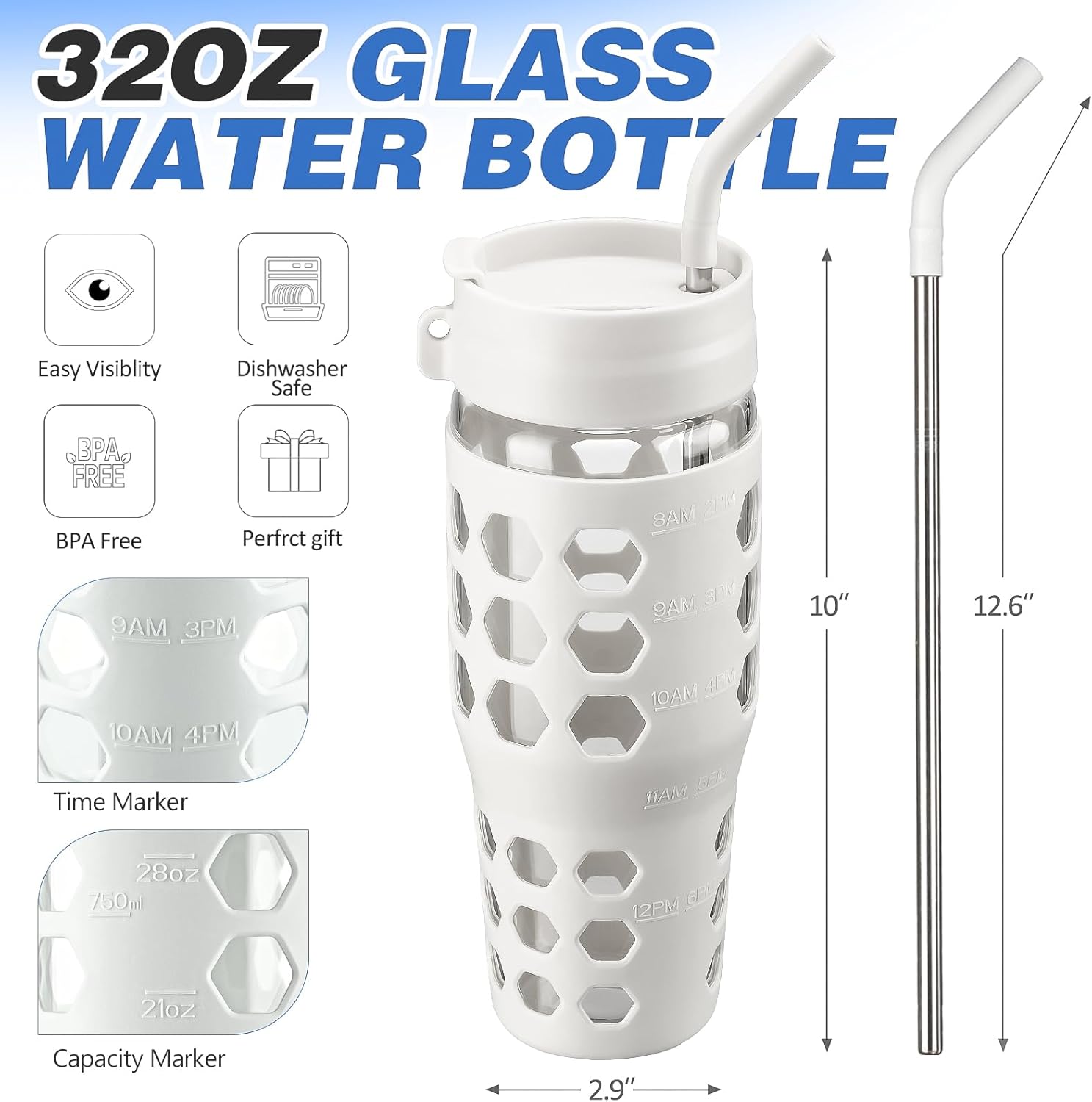 MUKOKO 32 oz Glass Tumbler with Straw,Glass Water Bottles with Time Marker,Iced Coffee Cup with 2 Lids-Handle Spout Lid&Straw Lid,Silicone Sleeve,Leakproof,1 Pack-White
