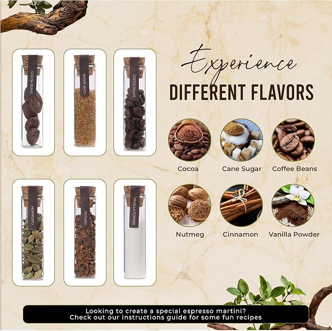 - CRAFT COCKTAIL PERFECTION AT HOME – This complete espresso martini kit gift set includes 6 exotic botanicals (cane sugar, vanilla powder, cocoa beans, nutmeg, coffee beans, cardamom) for crafting the most exquisite espresso martinis with ease.