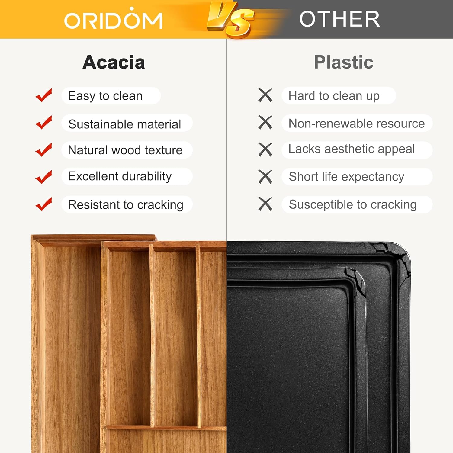- ăMoney -Back Warranty with OridomăAt Oridom, your happiness and satisfaction are at the heart of what we do. We're dedicated to delivering not just premium products, but also top-tier customer service: a full 1-year warranty, a no-questions-asked money-back guarantee, and round-the-clock customer assistance. We're here for you every step of the way, what you can get are high quality acacia utensil organizer for kitchen drawers and friendly customer service.