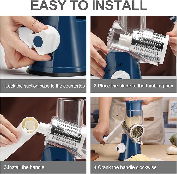 Cambom Rotary Cheese Grater Hand Crank Cheese Shredder for Fresh Cheese, Vegetable, Nuts, Non-slip Suction Base,Five Blades, Deep Blue