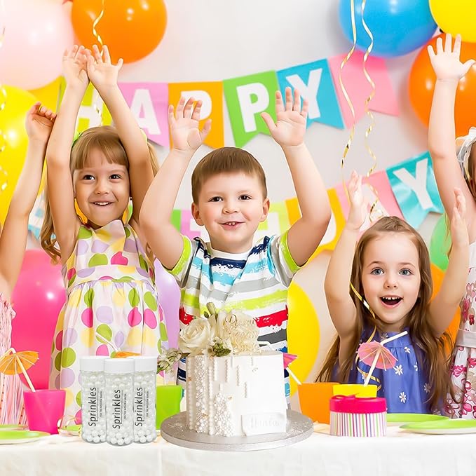 - 【Material of Edible Pearls Sprinkle】: The white pearls sprinkle is made of edible safe ingredients, and it is soy free, nut-free, peanut-free, and dairy-free. Vegetarians can also eat with confidence. The candy sprinkles meet American food standard, guard for the health of you and your family. Keep it in a cool place or refrigerate. It's eatable dessert candy donut decorations.