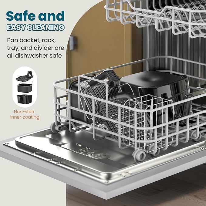 - Dishwasher-Safe & Easy Cleaning : The removable and non-stick baskets and pans are dishwasher safe,making cleanup a breeze. Spend less time scrubbing and more time enjoying your meals.