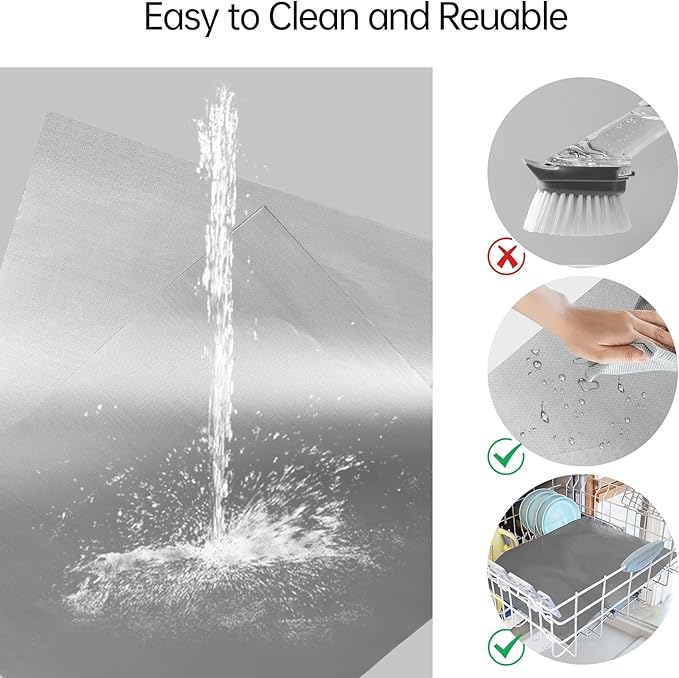 - Keep your oven spotlessly clean with our non-stick oven liners! They catch drips, cheese, sauces, and other baked messes, making cleaning a breeze. Plus, you can wash them in the dishwasher for easy maintenance