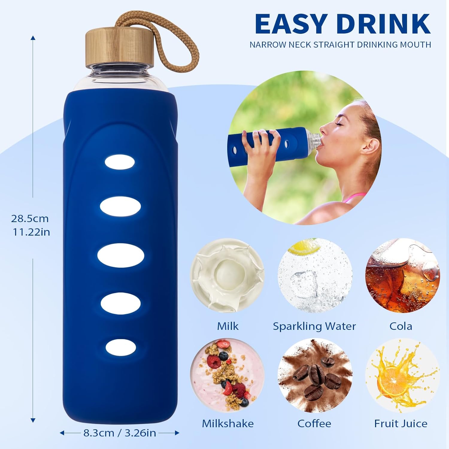 - STYLISH AND PORTABLE : Our sleek design makes the glass water bottle has an ideal travel buddy and elegant appearance. Outer Silicone sleeve offers secure grip and helps protect against breakage.