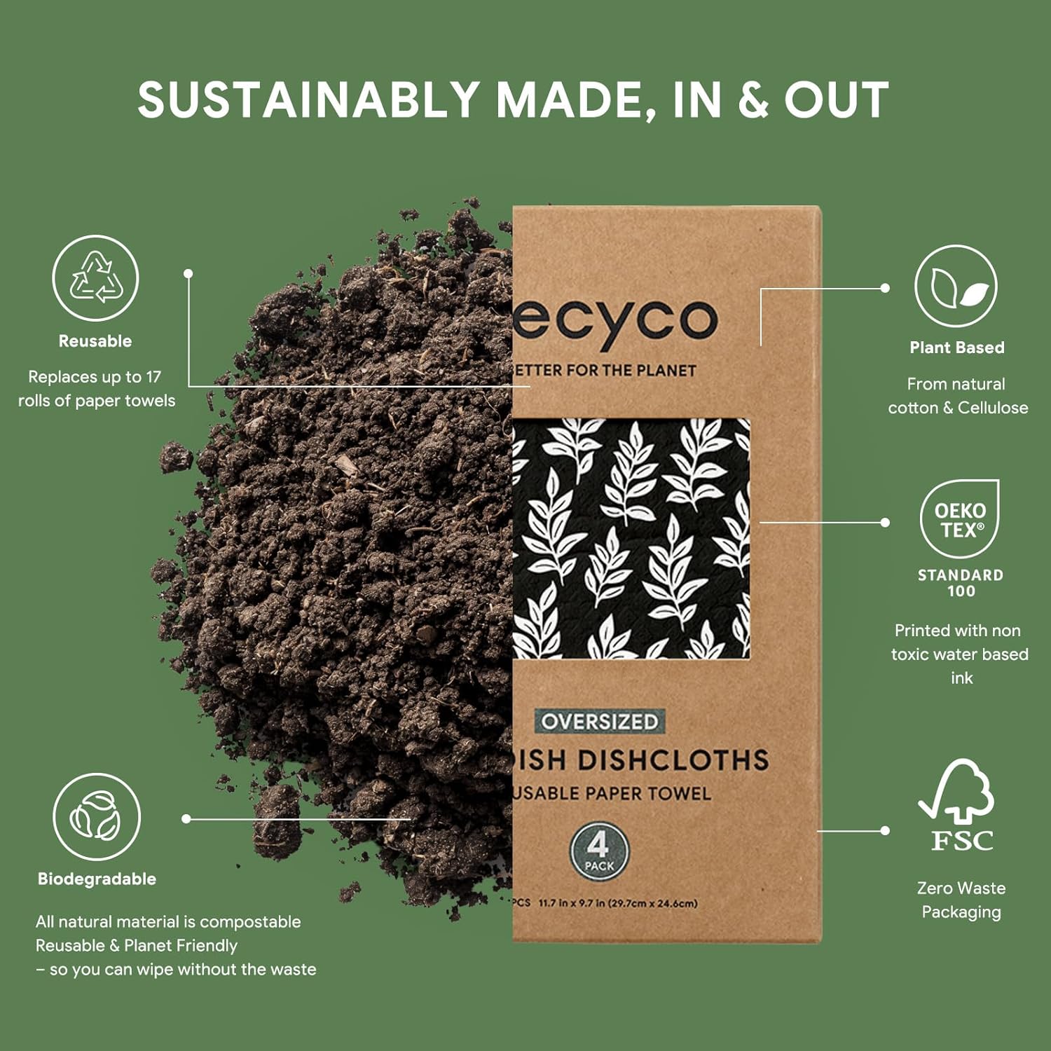 RECYCO Swedish Dishcloths for Kitchen | 4 Pack Oversized Washable Dish Rags | Large Cellulose Reusable Cleaning Paper Towels | Absorbent Counter Dish Cloth Sponge XL Kitchen Wipes, 12" L x 10" W