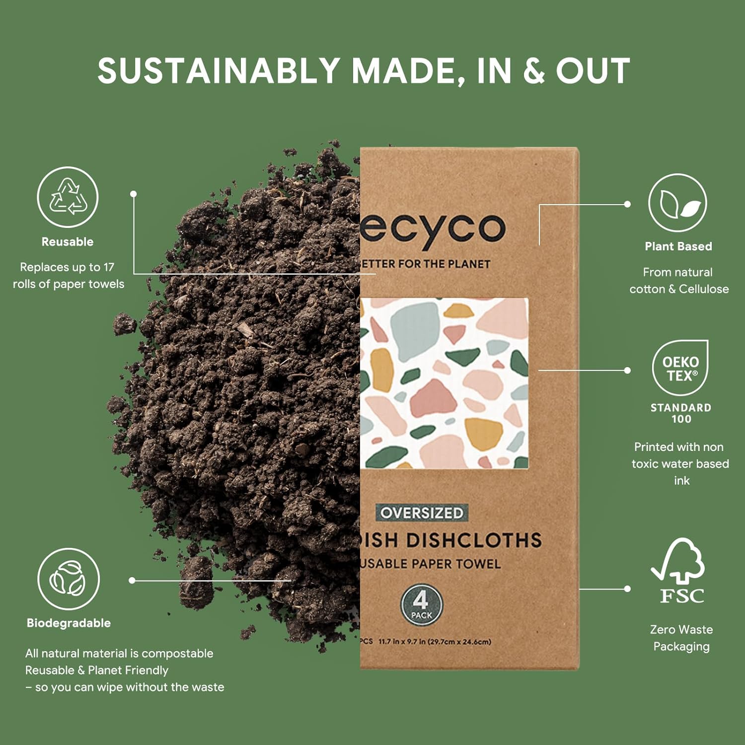 - Plant-Based & Biodegradable: Our 12” x 10” swedish dishcloth is 100% biodegradable, vegan, and free from harmful chemicals. Made from FSC certified cellulose and cotton fibers, it can decompose naturally in just 6-8 weeks, making it your best conscious choice for a greener lifestyle.