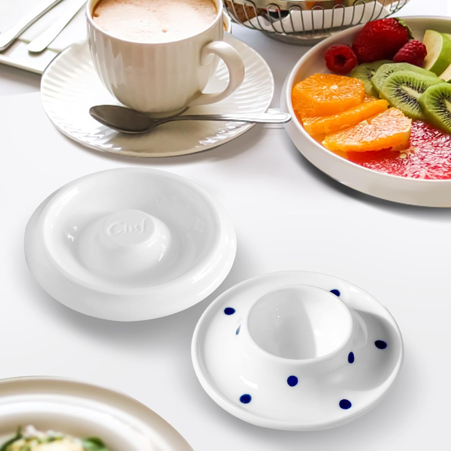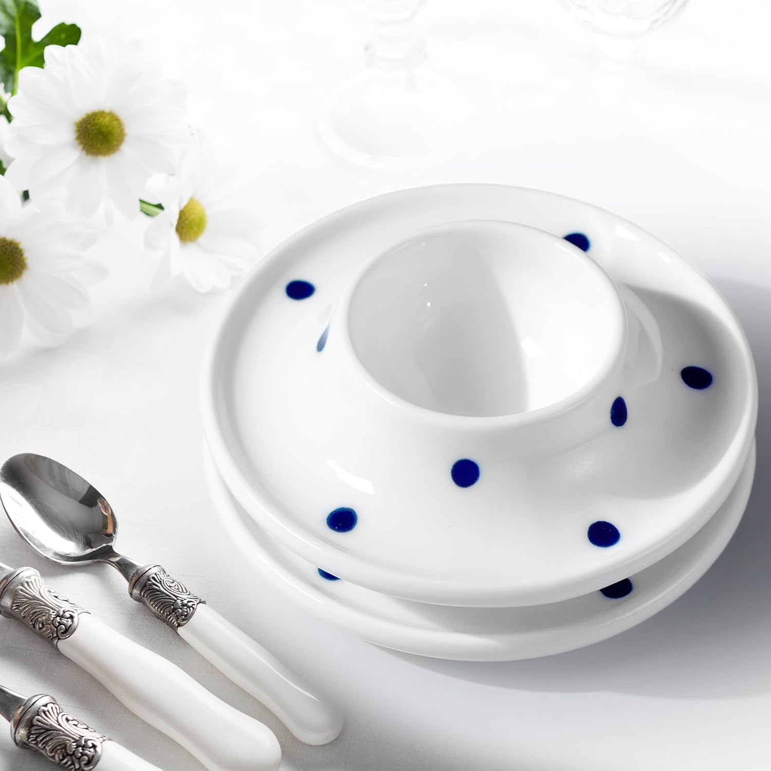 Cinf Ceramic White Egg Holder Set of 2 Porcelain Holder Breakfast Boiled Cooking Easy to Clean Childhood Memories Kitchen(Blue Dot)