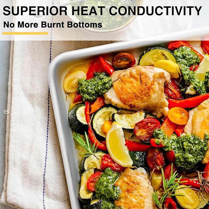 - PURE UNCOATED ALUMINUM & SUPERIOR HEAT CONDUCTION: Crafted from 100% bare aluminum with NO chemical coatings – guarantees safe, toxin-free cooking. Engineered for lightning-fast, even heat distribution (up to 30% faster than steel!) for perfectly crispy cookies, golden roasted veggies, and juicy meats every time. The aluminum baking pans are made of thick and heavy aluminum, with a heavy rolled edge making this truly "commercial-grade"that provides maximized scratch resistance