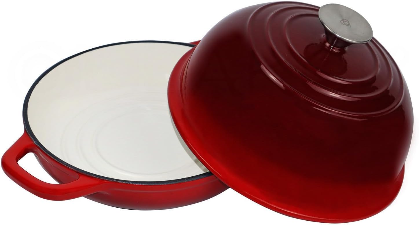 - Material features: Made of cast iron, glossy enamel exterior and white enamel interior, stable performance, oven safe up to 500โ. Compatible with various heat sources: gas, induction, ceramic, electric, oven, etc
