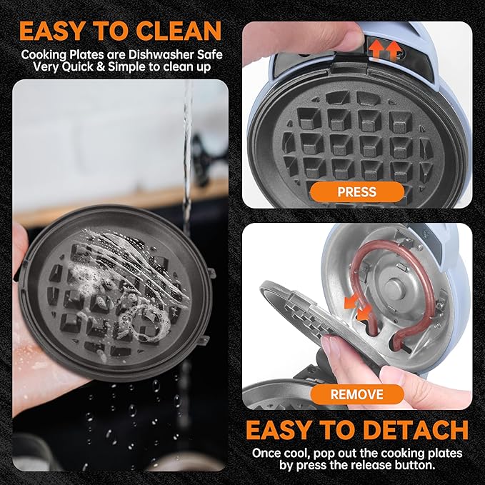 Baker's Friend 4 in 1 Mini Waffle Maker with Removable Plates, Set Includes Mini Pancake, Donut, Heart Shape Waffle Makers, Compact Size, Recipe Included, Blue