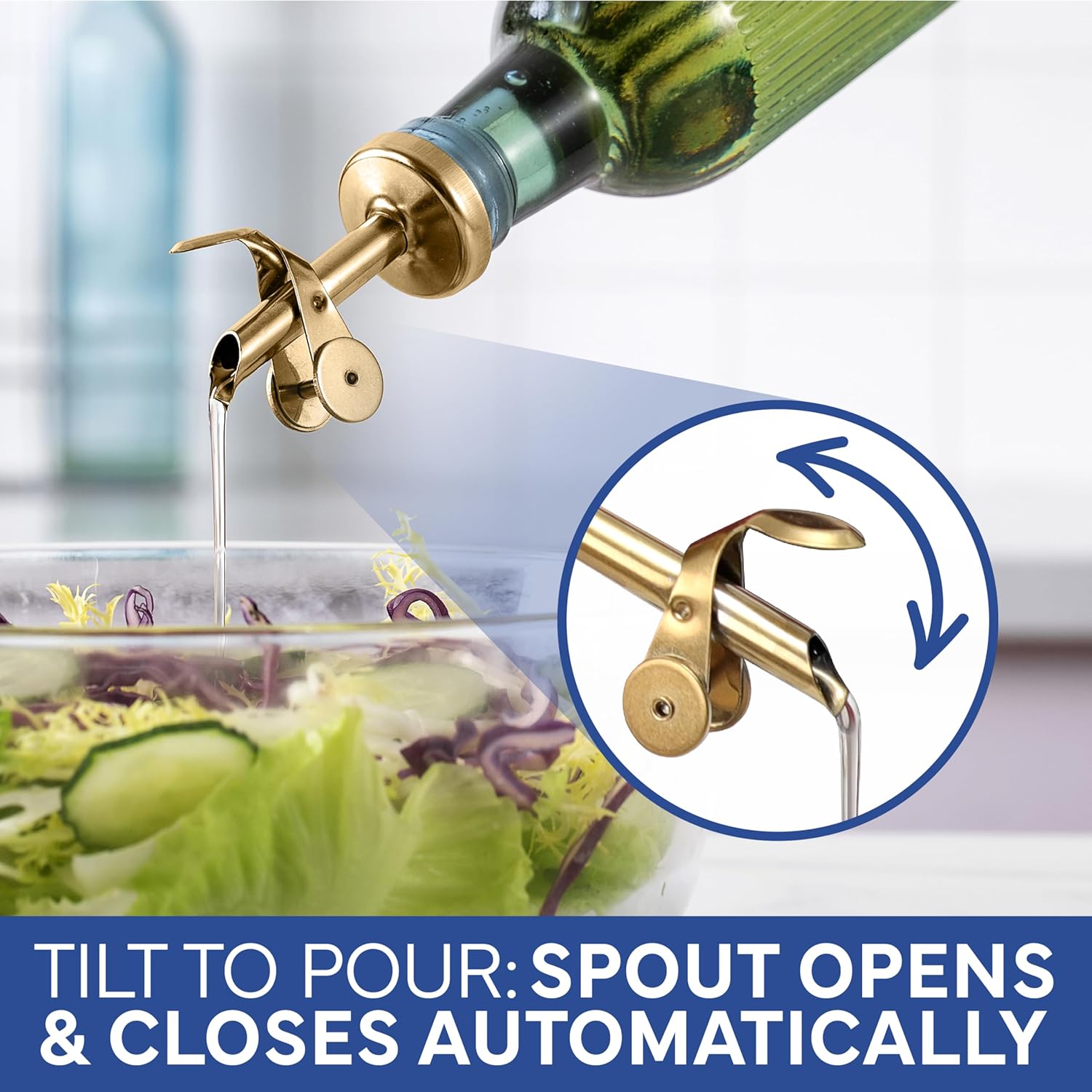 - Auto Flip Spouts - Drip free and mess free with our auto flip spounts. You'll get precise and smooth dispensions of your favorite oils and vinegars.