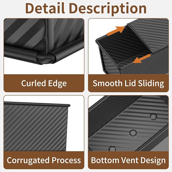 - INGENIOUS DESIGN - 1.The bottom ventilation design of the bread baking pan with lid enhances the baking effect, preserves the taste and quality of food, and increases the durability of the bread pan. 2.The rolled edge design makes the edge of the baking pan easier to grip and lift. 3.Featuring a user-friendly sliding lid design, the lid can be opened or closed for use in the oven