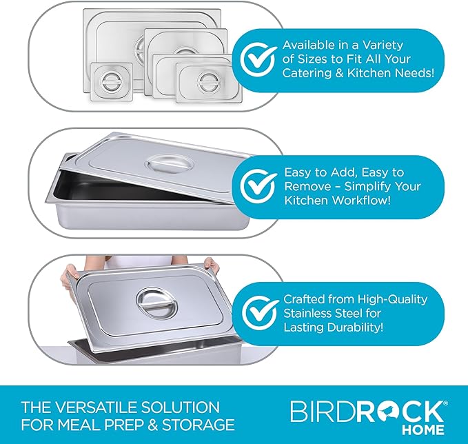 - STAINLESS STEEL LIDS: BIRDROCK HOME Stainless Steel Steam Table Pan Lids are crafted for restaurant and catering needs. These versatile lids are ideal for meal prep, cooking, and food storage, keeping food protected and at the right temperature.