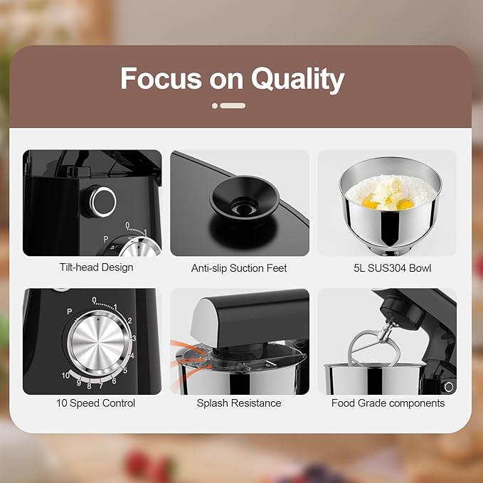 - 10+0 speeds Rotary Knob with Pulse Function - This Mixer has 10 different speed options, suitable for mixing bread dough, thick batters, meringues, and whipping cake cream, plus lower speeds for stirring and finessing your most delicate concoctions, could suit perfectly to different ingredients. Keep the machine steady and avoid moving or bounce during operation.