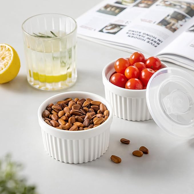 vancasso 8 oz Ramekins with Lid, Porcelain Creme Brulee Souffle Dishes, White Pudding Custard Cups Ramiken for Baking, Dishwasher and Oven Safe, Set of 6