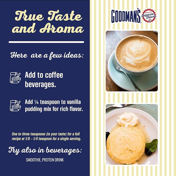 - Creative Uses: Expand your culinary horizons by incorporating Goodman's Natural Butter Extract. Besides traditional baking, elevate your morning routine by adding a splash to your coffee or creamer.