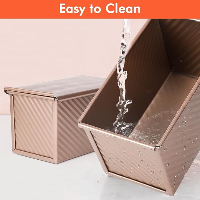 - Non-Stick Coating & Easy to Clean --- The pretty slick nonstick coating on loaf pan which is easy to clean, making the bread dough and baked bread can be removed from it easily. We suggest that spray the pan with some cooking spray before putting dough in it to get the nonstick coating working well. Moreover, be careful with the sharp inner curls and outer corners of the pans while using or cleaning them.