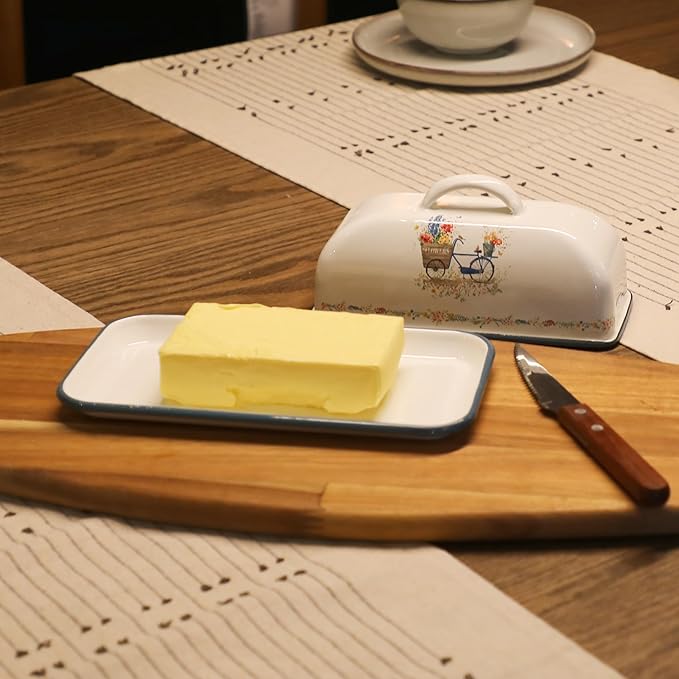 - STYLE-This vintage-style butter dish is made of steel coated with white enamel.It's designed to be sturdy, practical and very beautiful.Unlike glass or ceramic, it will never smash