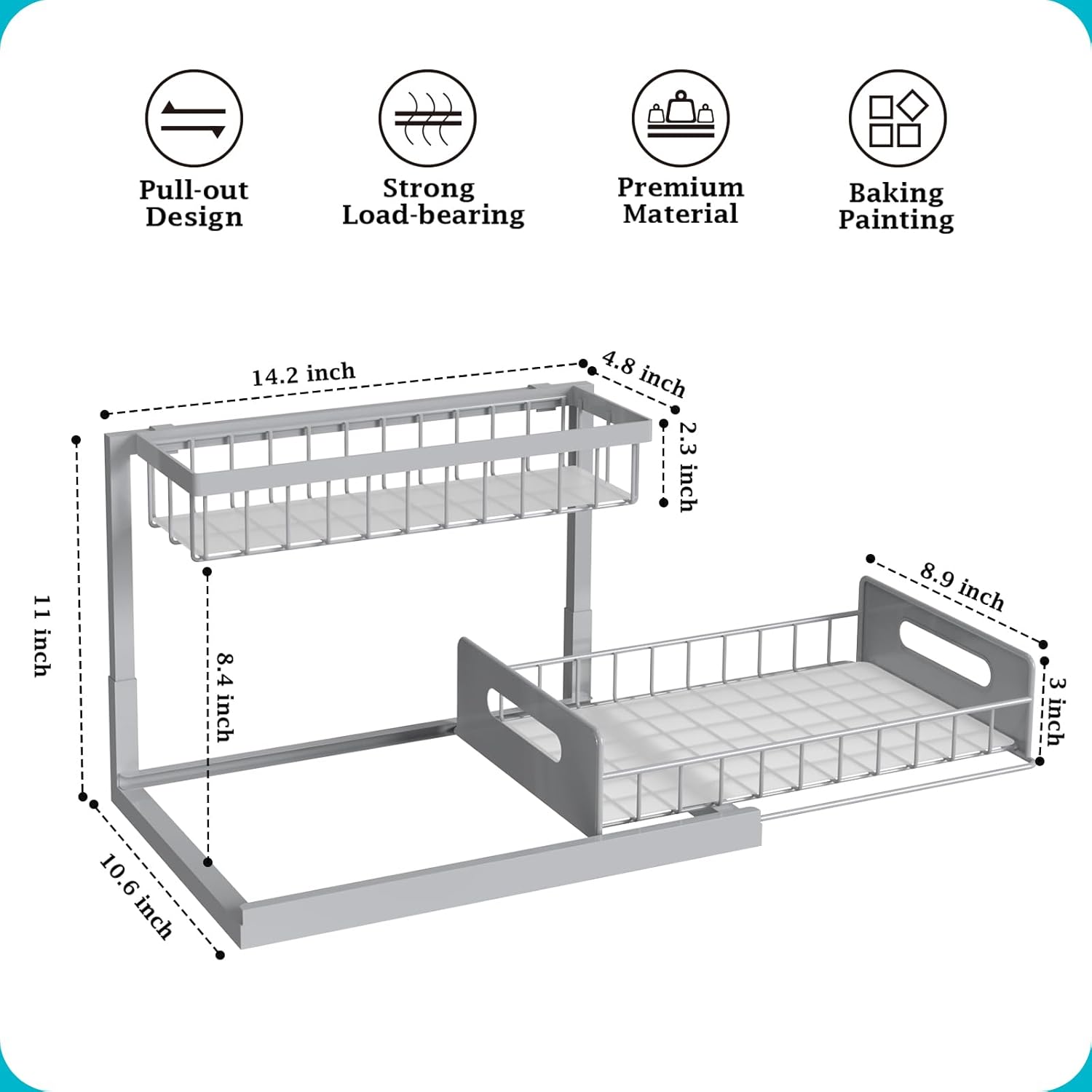 - Sliding Storage Drawer: The under sink organizer is designed as a sliding drawer with handles, can be pulled out smoothly, allowing you to easily access the items stored at the bottom.