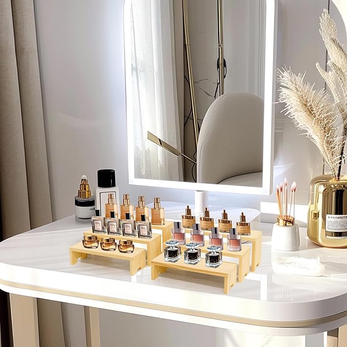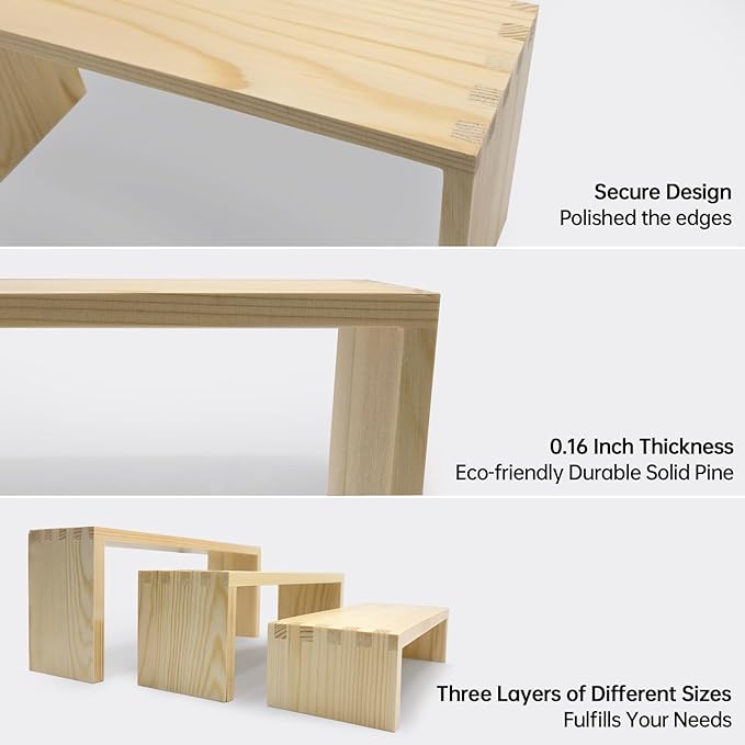- 【Wooden Tierd Risers for Display】🎁: This 4 set 3 tier small display shelf for cupcakes or vendors has stackable nesting design, so the wooden display risers easily access as desktop storage racks,also they has strong load-bearing capacity for more kinds perfumes, collectible figures,kitchen condiment bottles, bathroom toiletries because of varieties size of (L7.8''/20cm-8.6''/22cm-9.4''/24cm)XW2.9'' /7.3cm