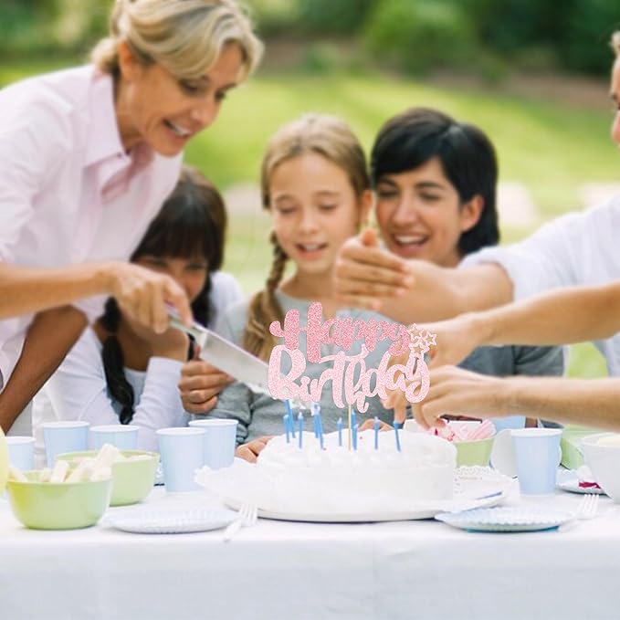 Ephlyn 1Pcs Happy Birthday Cake Topper Glitter Happy Birthday Cake Pick Decorations for Celebrating Happy Birthday Anniversary Theme Party Cake Decorations Supplies Pink Light Pink