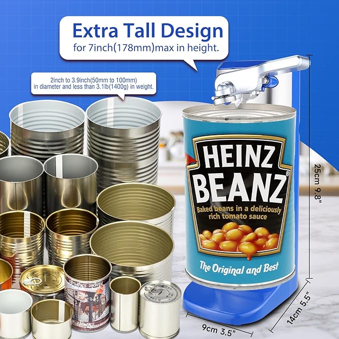 - 【Opens almost Any Cans】With a heavy-duty motor and a stable base to keep it steady during operation, our automatic can opener can open all types of cans from 50 to 100mm in diameter,net weight ≤ 1400g and height less than 178mm.Whether you have square cans, round cans, or even deformed cans (except for cans with recessed edges).
