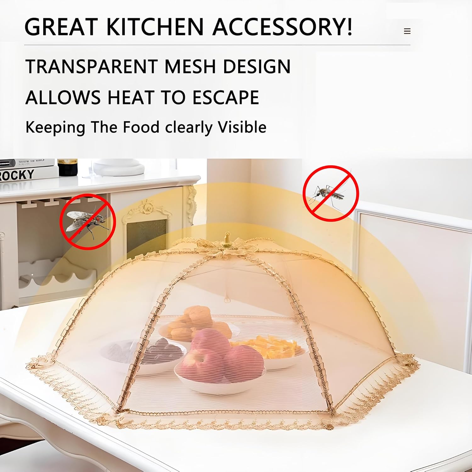 - 2.Food screens for outside reduce stress and improve al-fresco dining. Bottom of collapsible food covers are finished with moderate lace edging acting as a barrier, an effective net for food. Re-usable outside food covers protect platters of food better than tinfoil, paper towels or paper plates with zero waste. Include the food pop up tent in all your party supplies.
