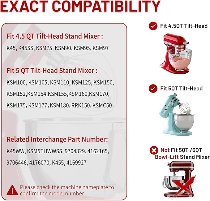 - EXACT COMPATIBILITY: Designed for kitchenaid 4.5Qt and 5Qt tilt head stand mixer, Fits KitchenAid mixer models K45, K45SS, KSM75, KSM90, KSM95, KSM100, KSM103, KSM110, KSM150, KSM152, KSM155, etc., replacements for K45WW,KSM5THWWSS, 9704329, 4162165, 9706446, 4176070, K455, and 4169927 part numbers. not fit bowl-lift stand mixers.