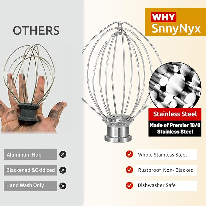 - RUST & CORROSION RESISTANT:Made from high-grade 18/8 (304) stainless steel, this stand mixer whisk attachment is built to resist rust, corrosion, and oxidation, even with exposure to humidity and harsh detergents.