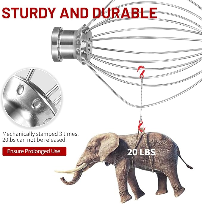 - STURDY & DURABLE:The strong stainless steel wires are firmly stamped into the stainless steel hub, ensuring they won’t loosen or fall out, no matter how fast your mixer spins.