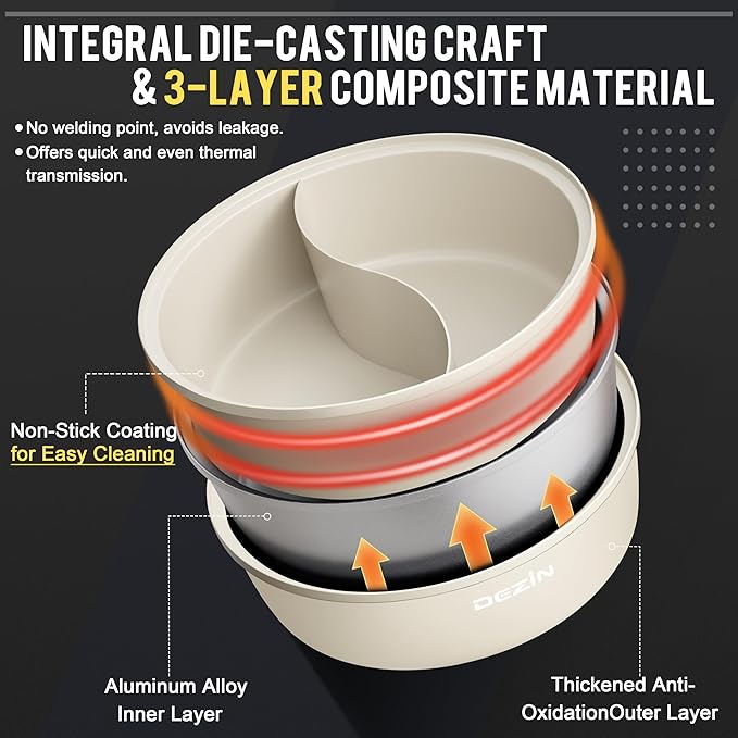 - Non-Stick Coating - The Dezin electric hotpot pot features a high-quality non-stick coating, providing excellent food release and easy cleaning. With this coating, you can enjoy cooking without worrying about food sticking to the pot. It also enhances stir-frying, making your cooking experience smooth and enjoyable.
