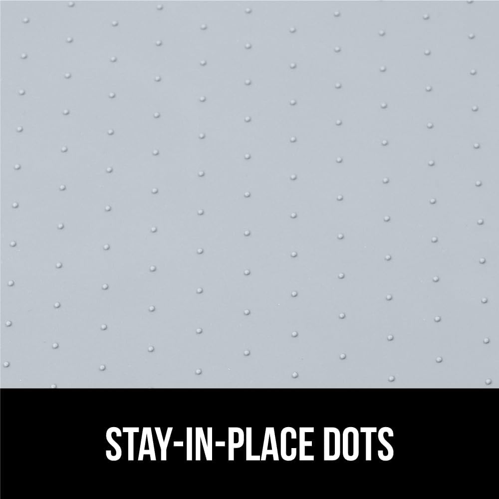 - STAYS IN PLACE: designed to lay flat and grip your cabinets, mat stays in place with daily use taking items in and out; raised silicone dots on the topside help prevent items from slipping and sliding around the mat