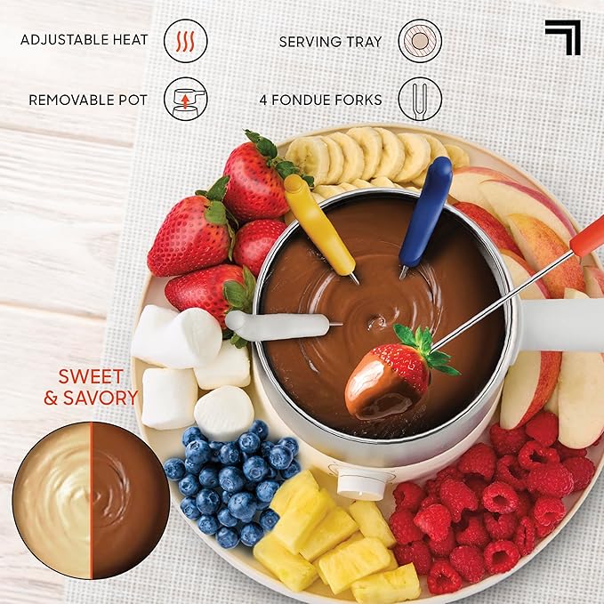 - ✔ ADJUSTABLE HEAT CONTROL FOR PERFECT RESULTS: Customize the temperature to achieve smooth, delicious fondue every time, whether you're melting rich chocolate or savory cheese. Ideal for a wide range of dipping options.