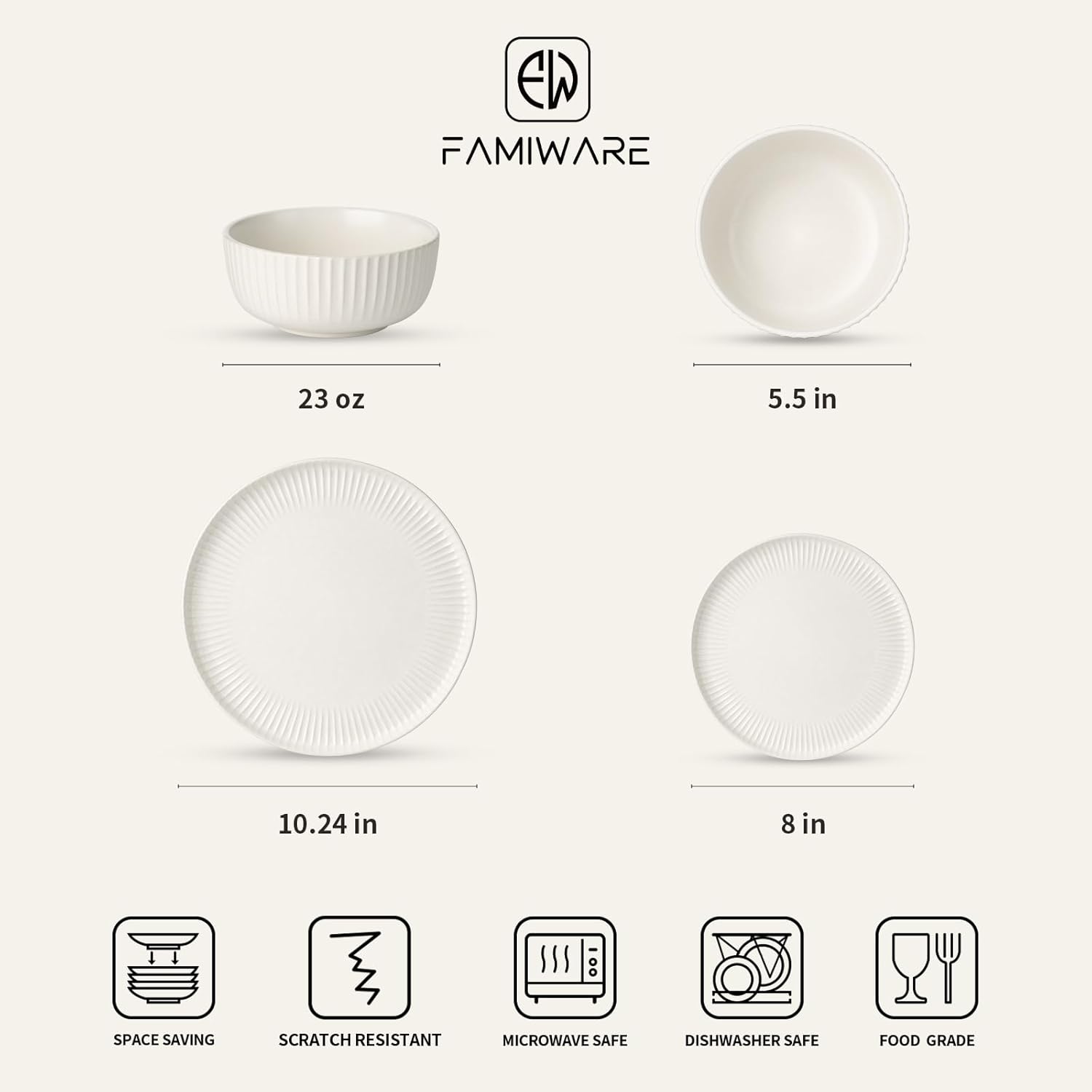 Famiware Starlight Dinnerware Sets, Plates and Bowls Dish Set of 4 (12 Pieces), Ribbed Textured Tableware - Dishwasher & Microwave Safe, Chip Resistant, Reactive Glaze, Matte Reactive White
