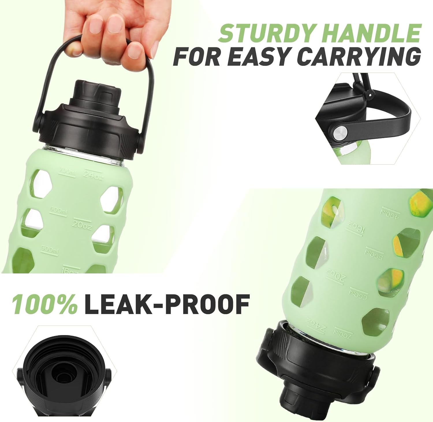 - GLASS WATER BOTTLES WITH TIME MARKER:MUKOKO 24oz glass water bottle with time marker preserves the purity of water.This is a very handy way to keep up with daily water intake,stay hydrated and healthy.
