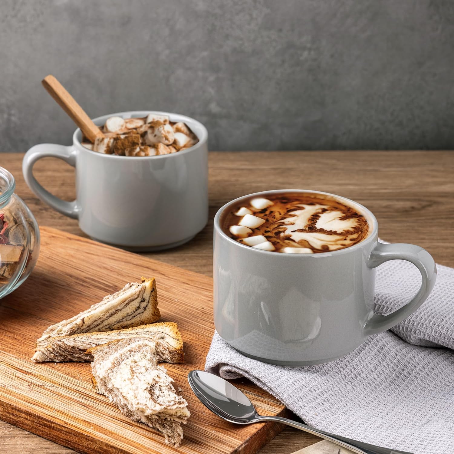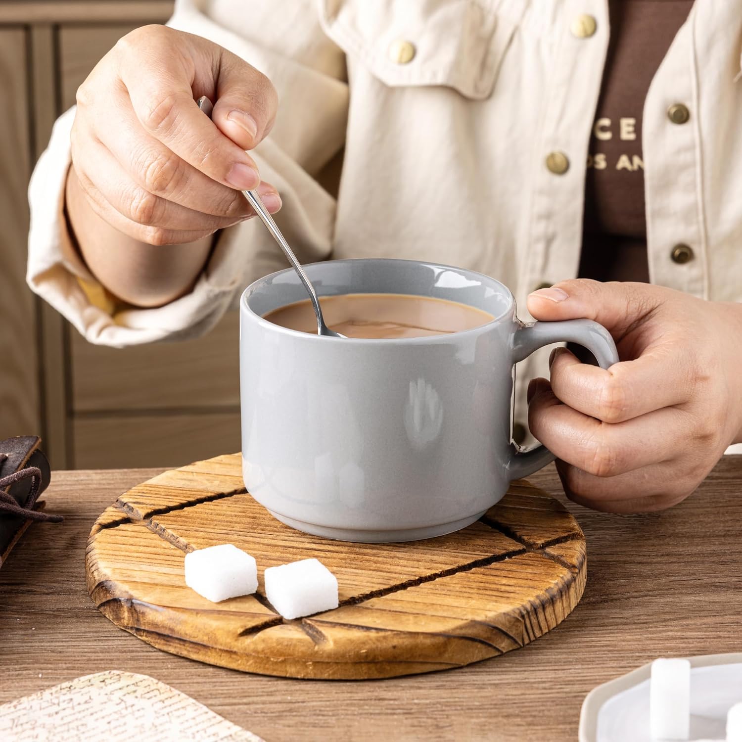 - Stylish DesignWIth Large Handle Design: These coffee mugs features a large handle that provides a comfortable and secure grip. the handle remains cool even after microwaving and the beverages stay warm. These mugs set feature a beautiful embossed texture design, the smooth rim ensures a comfortable drinking experience, and the stackable design allows for easy storage and helps save space in your kitchen.