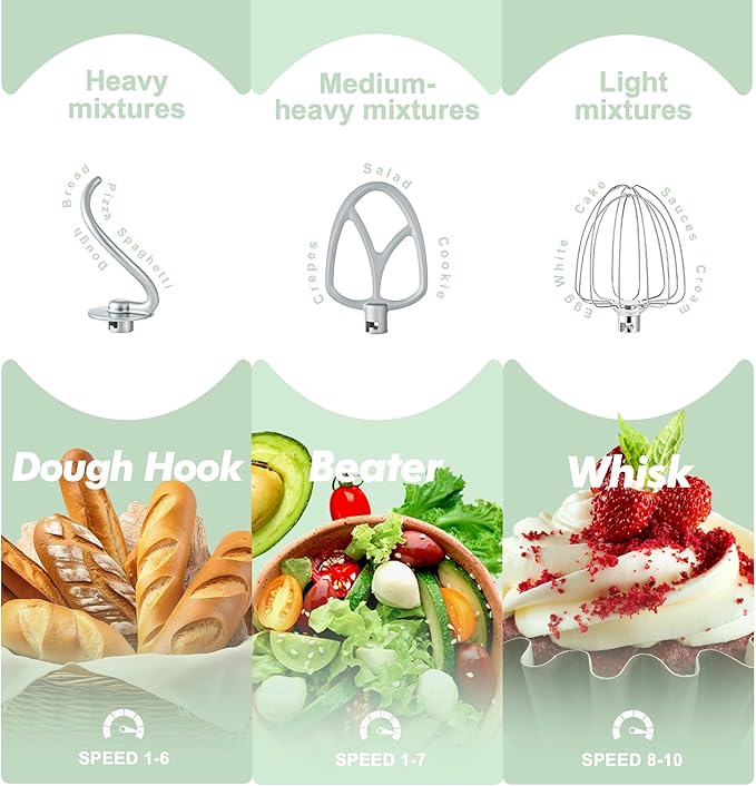 - 10 Speeds and Tilt Head Design - This Kitchen mixer has 10 different speed options,suitable for mixing bread dough, thick batters, meringues, and whipping cake cream, plus lower speeds for stirring and finessing your most delicate concoctions,could suit perfectly to different ingredients. Tilt-head design mixer allows access to install or uninstall bowls and accessories easily.