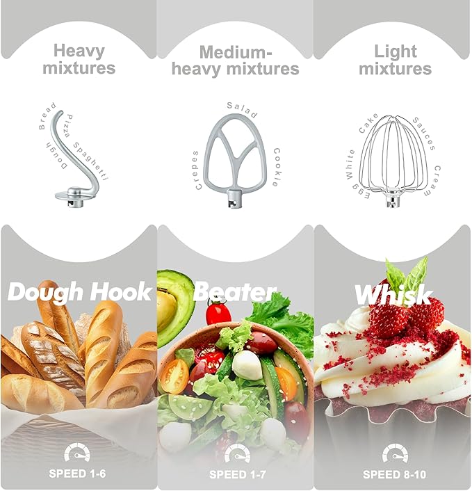 - 10 Speeds and Tilt Head Design - This Kitchen mixer has 10 different speed options,suitable for mixing bread dough, thick batters, meringues, and whipping cake cream, plus lower speeds for stirring and finessing your most delicate concoctions,could suit perfectly to different ingredients. Tilt-head design mixer allows access to install or uninstall bowls and accessories easily.