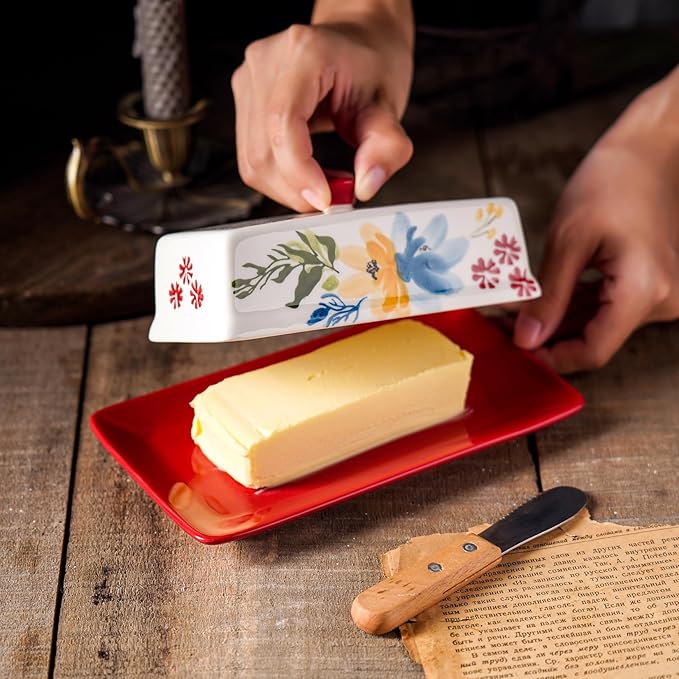 Butter Dish Ceramic Butter Keeper Butter Dish with Lid, Butter Container, RED