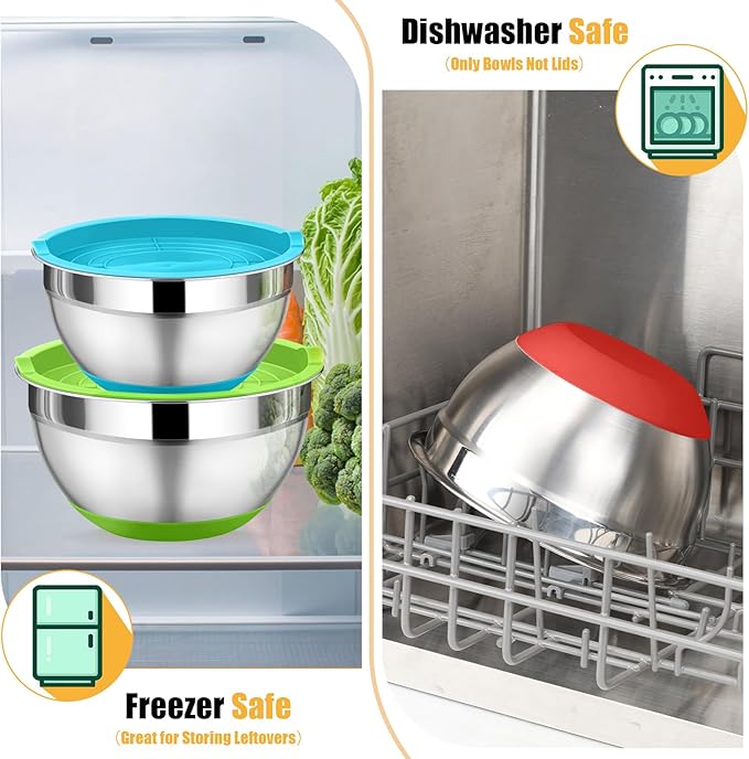 - 【Thoughtful Design】The mixing bowls with colorful lids set is specially lightweight to save your effort when you need to transport bowl with full food, Airtight lids could close snugly on the bowl to create an airtight storage container, And keep your food fresh to avoid food spills or leaks, Silicone bottom increases friction with the table, To help you focus on mixing and whisking without worrying about the bowl sliding unexpectedly and producing annoying noise, Smooth rolled edges of the bowl without any rough burrs for comfortable grip