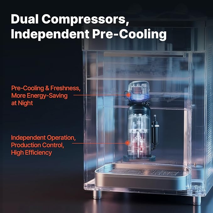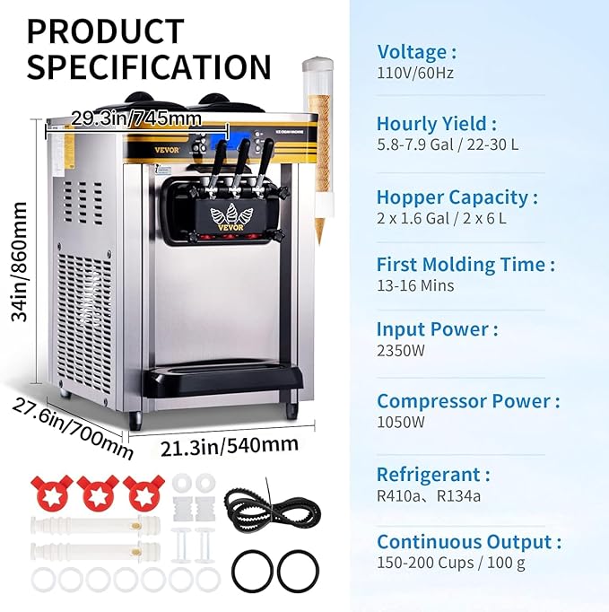 - Powerful Performance: The 2350W total power provides continuous and long-lasting power for our soft ice cream maker. Adopts a 1050W famous brand compressor to ensure high efficiency and low noise during operation. Expansion tubes make your ice cream look more attractive while increasing yield by 25%-30%. Plus, shortage alerts will remind you to add more ingredients to the mixing hopper. With features this sweet, you can't go wrong.