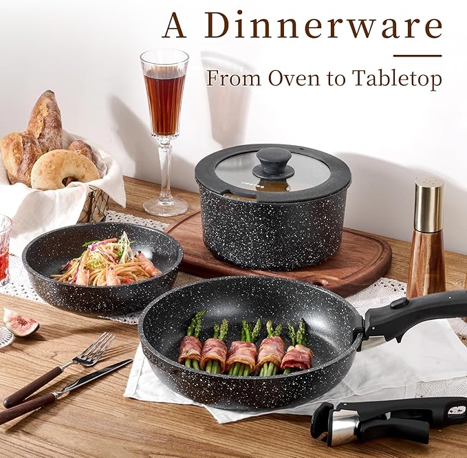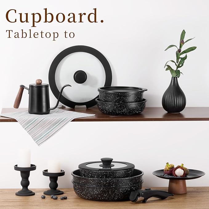 - Optimal Storage: Neatly stack all the detachable handle pots and pans, saving 75% of cabinet space—keeping the kitchen organized and tidy. Perfect for compact kitchens and an ideal choice for RVs or campers.