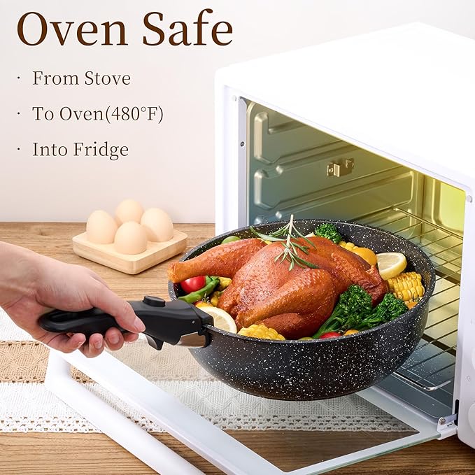 - Oven Safe: The cookware set is oven-safe up to 480°F, making it suitable for baking, roasting, and grilling. It is also suitable for use on gas stoves, electric stoves, and induction stoves. Please remove the handle from pots and pans set when heating.
