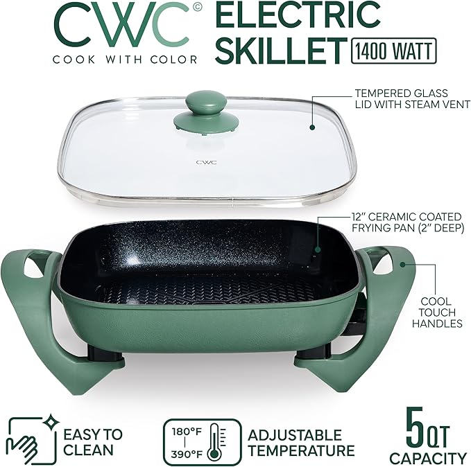 COOK WITH COLOR Electric Skillet - 12" x 12" Ceramic Nonstick Pan, PFAS-Free, 1400W, Tempered Glass Lid, Variable Temperature, Removable Heating Probe, Cool-Touch Handles, Dark Sage