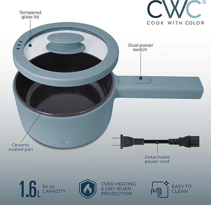 COOK WITH COLOR Electric Hot Pot, 1.6L Mini Cooker, 700W Power, Non-Stick Surface, Thermal Cut-Out Protection, Perfect for Rice, Noodles, Soups, Stews, Dorms, Apartments, and Small Kitchens, Blue Grey