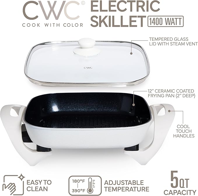COOK WITH COLOR Electric Skillet - 12" x 12" Ceramic Nonstick Pan, PFAS-Free, 1400W, Tempered Glass Lid, Variable Temperature, Removable Heating Probe, Cool-Touch Handles, Cream