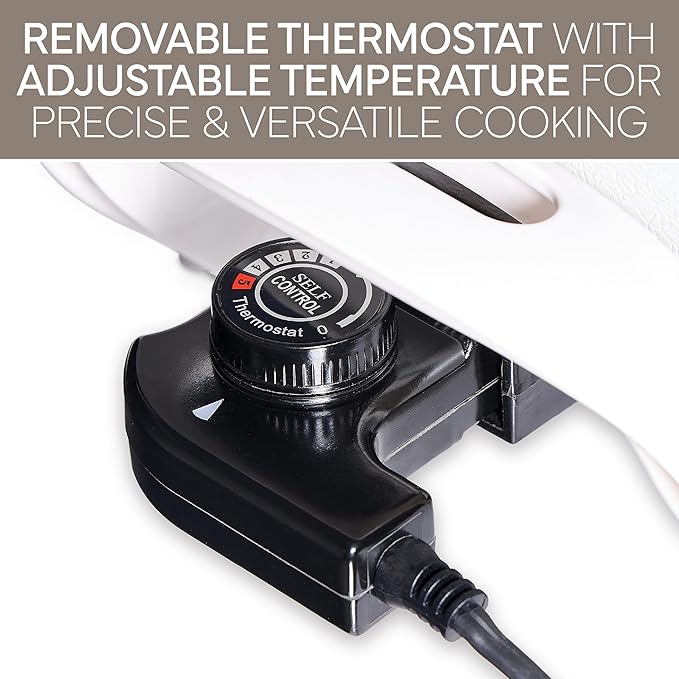 - Precise Temperature Control: Includes an on/off indicator light and a removable thermostat with variable temperature settings. Easily adjust the heat for accurate cooking control and achieve perfect results while preventing overcooking.