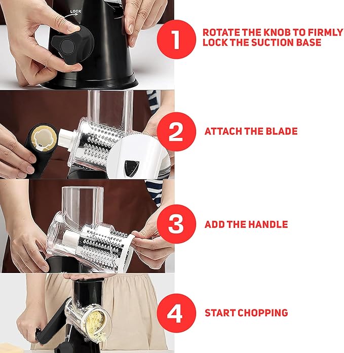 - [STURDY AND SAFETY] Featuring a strong suction base, our rotary grater stays securely in place on smooth countertops, preventing slips during use. The handle design keeps your hands away from the blades, offering a safer grating experience.