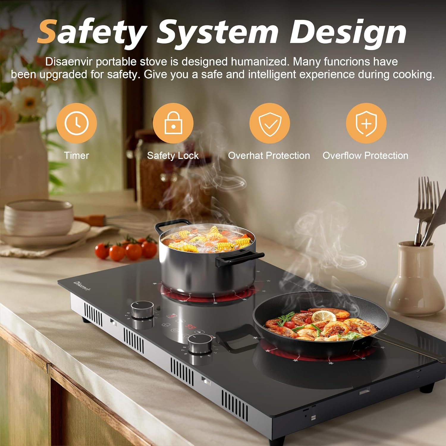 - 🚨【Multi-functional Electric Cookop】Disaenvir plug in cooktop is equipped with a range of advanced features that enhance both convenience and safety. It includes a built-in timer function that allows users to set specific cooking durations. A child lock feature prevents accidental adjustments of the controls by kids or pets. Additionally, it has an overheat indicator that alerts users when the temperature exceeds safe levels, helping to prevent potential burns or fire hazards.