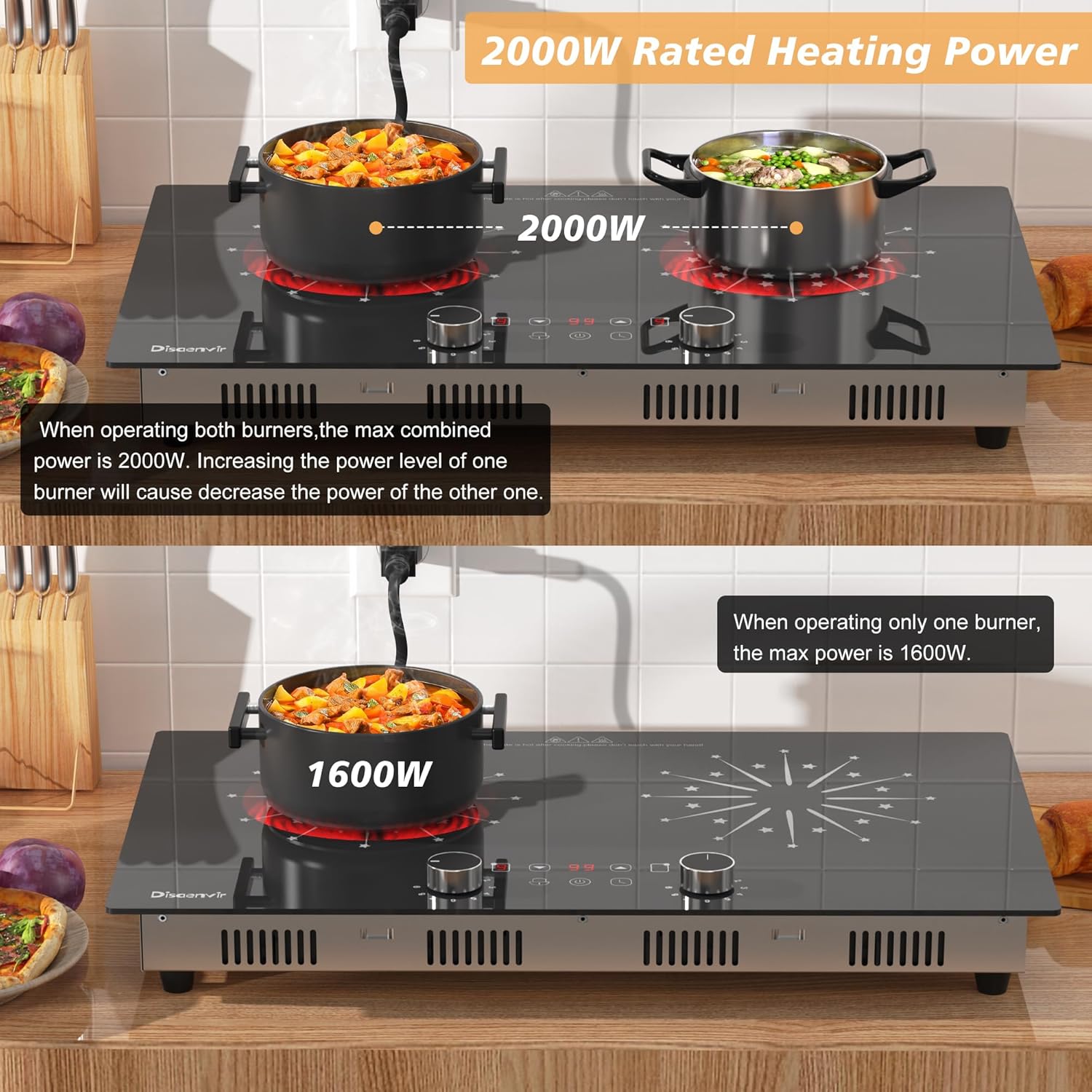 - ♨【2 Indpendent High Power Heating Zones】Using a 110-120V / 1600W(left plate) + 1600W(ring plate) power supply, Disaenvir portable electric stovetop has two separate cooking zones. When operating both burners, the max combined power is 2000W. Increasing the power level of one burner will decrease the other one's. If you only use one burner, the max heating power is 1600W, so this stove is capable of reaching high temperatures for efficient cooking from simmering to frying.